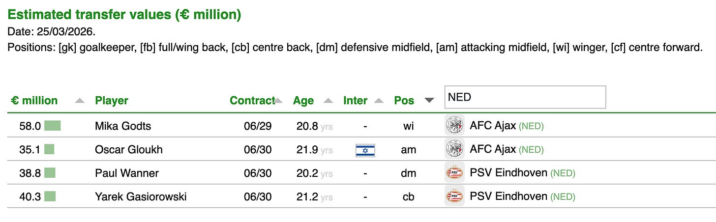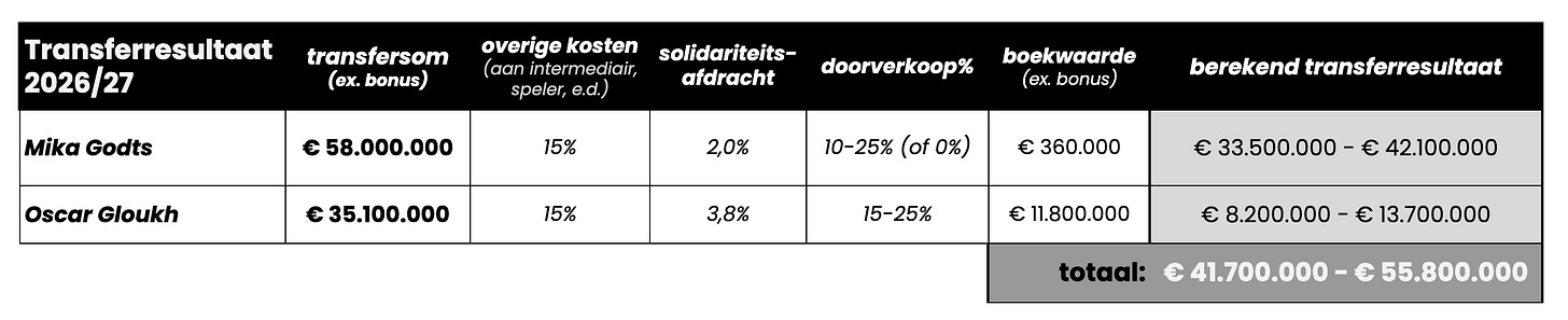 Maar zelfs met een conservatieve inschatting kom je al snel in een scenario waarin €50–60 miljoen aan transferwinst haalbaar wordt.