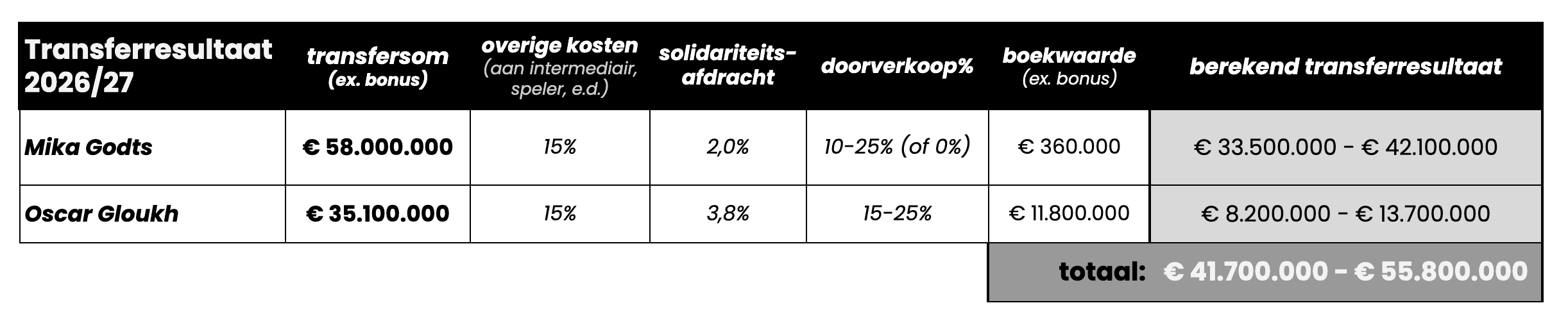 Hier zitten flink wat haken en ogen aan door veel onzekerheden, maar vooral bij Mika Godts lijkt er een forse winst haalbaar. En ook met lagere transferbedragen is voldoende winst mogelijk.