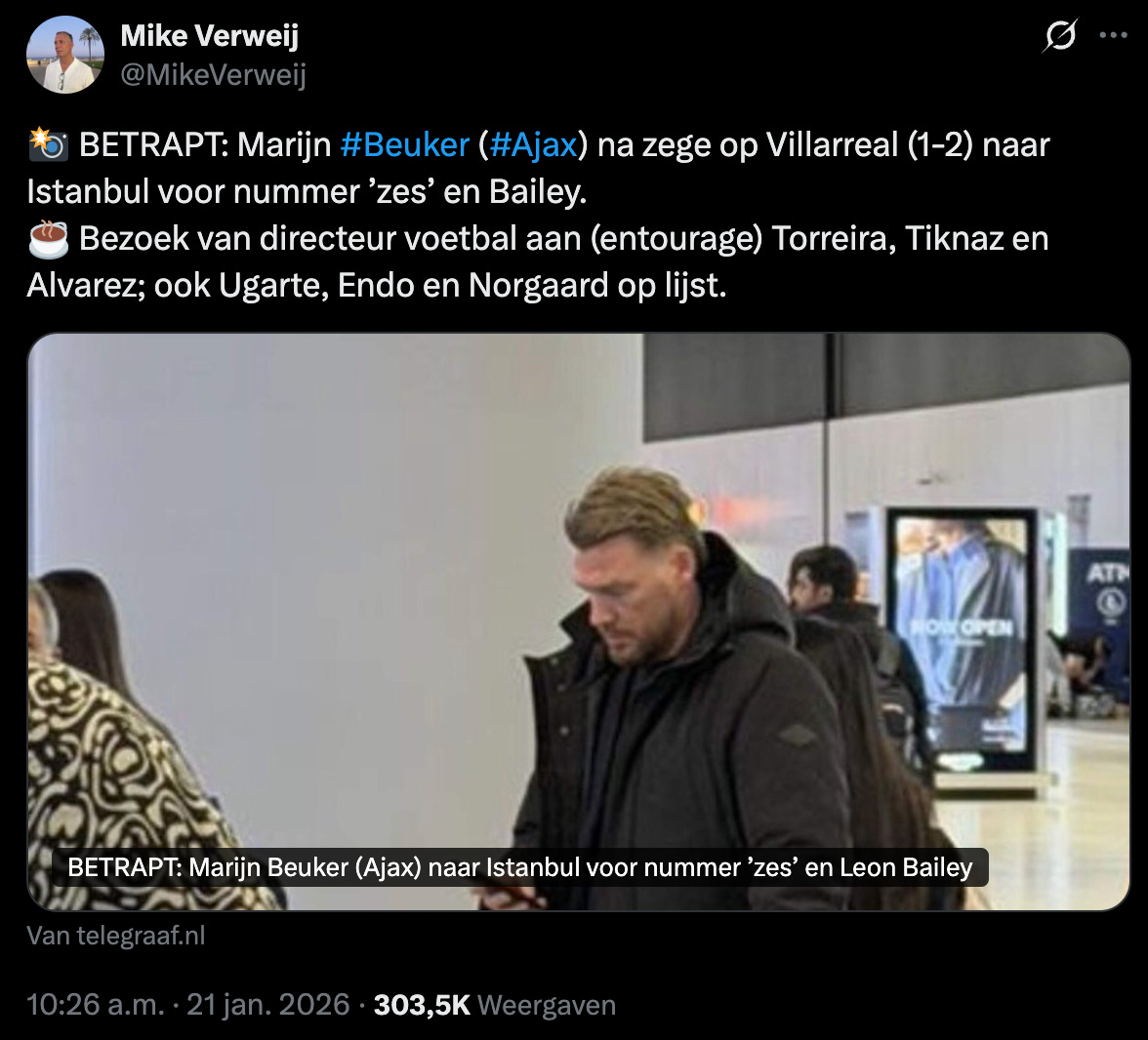 Geruchten zijn er volop. Ajax is zichtbaar actief, spreekt spelers, verkent opties. Tegelijkertijd loopt het veel mis: Guido Rodriguez, Tiknaz, Asprilla, Douglas Luiz, etc.