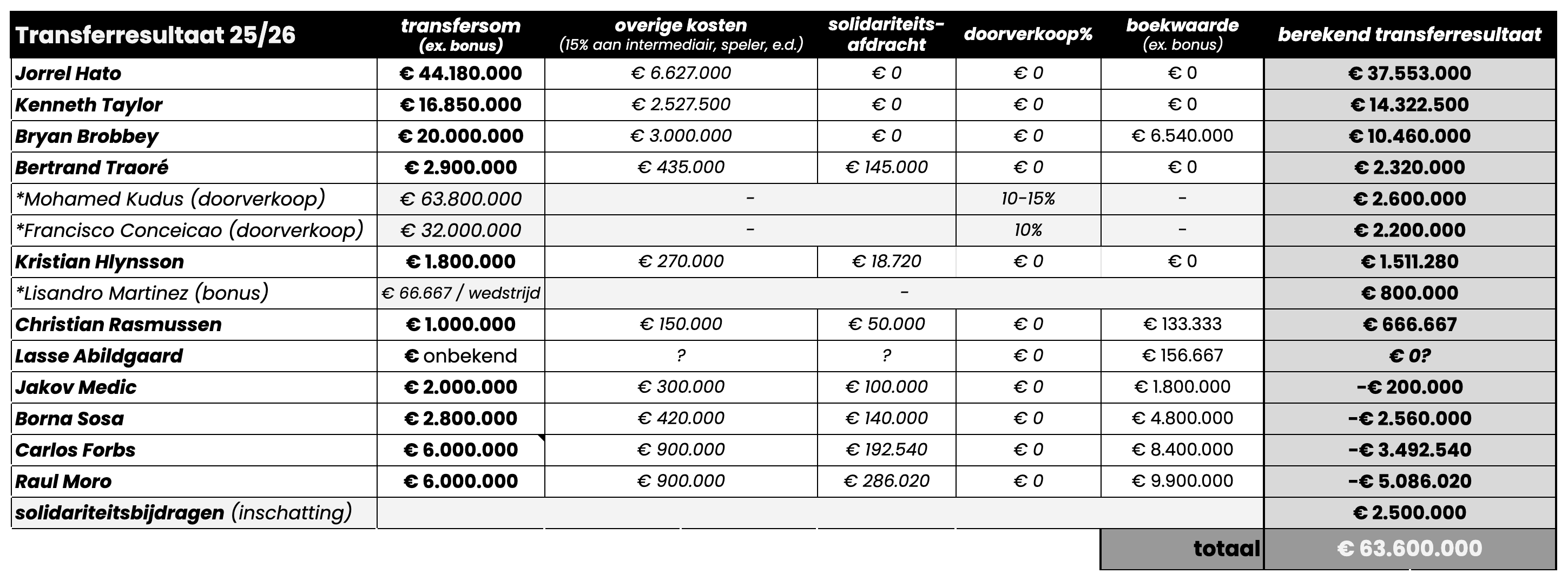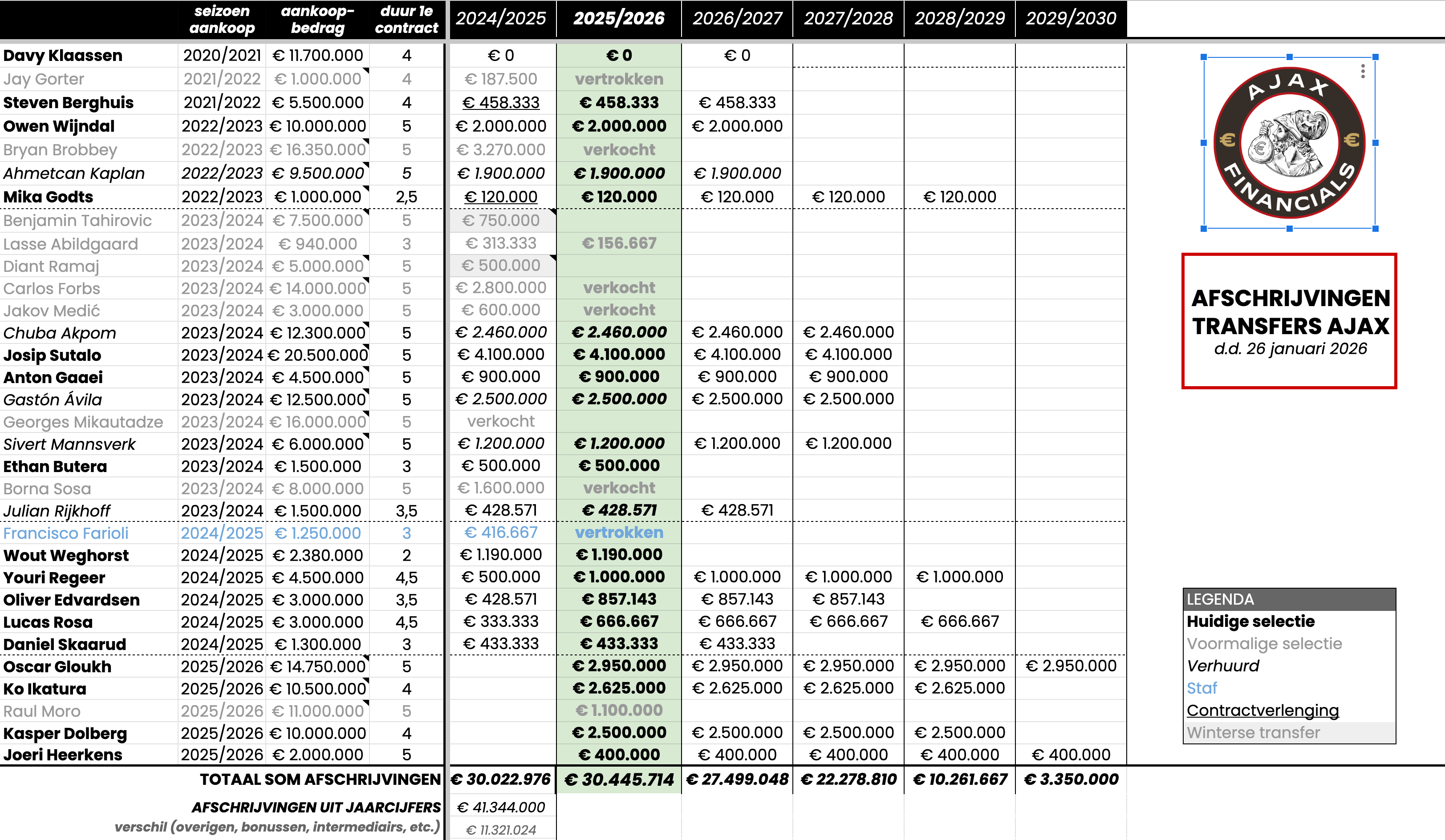 Het transferbudget van Ajax wordt bepaald door afschrijvingen op vergoedingssommen. Ajax heeft zichzelf de afgelopen periode bewust richting een niveau van circa €30 miljoen ‘kaal’ bewogen. Daar zit de club nu grofweg op, mogelijk zelfs iets boven. Zie hieronder.
